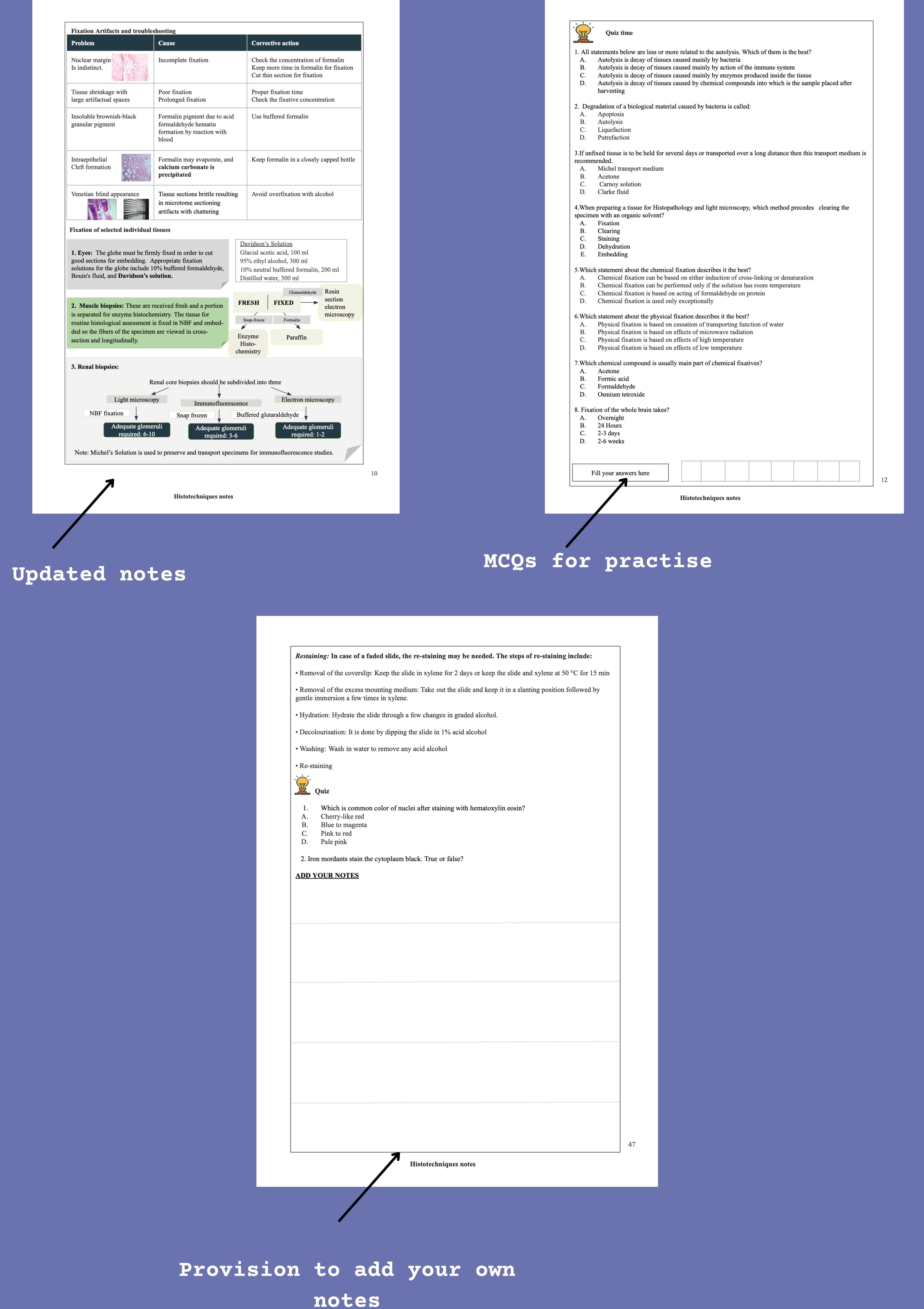 Our notes cover everything from tissue processing to staining and microscopy. No more flipping through endless pages of dense textbooks – we’ve distilled the most important information into one convenient, easy-to-read notebook in a visually appealing manner.